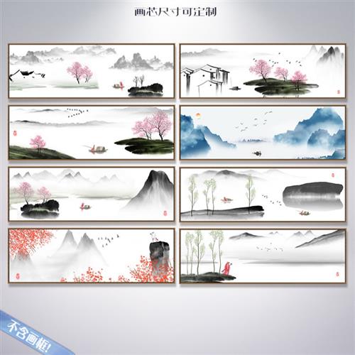 新中式横幅长条画禅意山水装饰画画心打印江南风景床头挂画定制热门设计联盟服务商